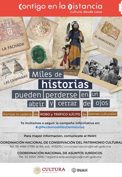Con el robo de los bienes culturales, lo que perdemos son miles de historias creadas por muchas personas a través del tiempo y materializadas en objetos. Cada vez que se roban o trafican un bien cultural perdemos oportunidades para seguir enriqueciendo estas historias mediante su conocimiento, disfrute e investigación. Conoce la campaña informativa.